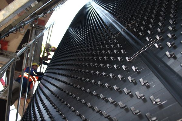 Auf der Rückseite der Betonschutzplatten befinden sich gleichmäßig und werkseitig extrudierte Ankernoppen. Beim Betoniervorgang werden diese vollkommen vom Beton umschlossen. Somit entsteht eine formschlüssige Verbindung. Diese "Fixierungspunkte" wirken der Ausdehnung der Auskleidung bei Temperaturschwankungen des Lagermediums entgegen. Dies ist als eindeutiger Vorteil im Vergleich zu einer nachträglichen PE Auskleidung zu sehen, da eine solche Anzahl an "Festpunkten" nicht wirtschaftlich dargestellt werden kann.